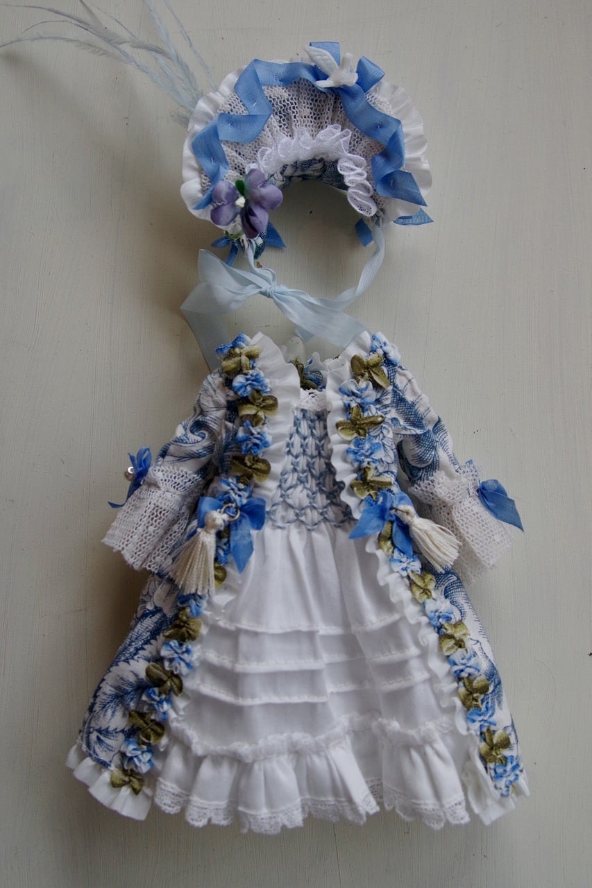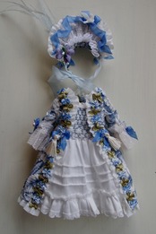 1.ドレス; トワルドジュイ柄のコットンをメインに、コットンサテンにスモッキング刺繍、フリル、ロココリボン、シルクタッセル、ピンタックで飾りました。