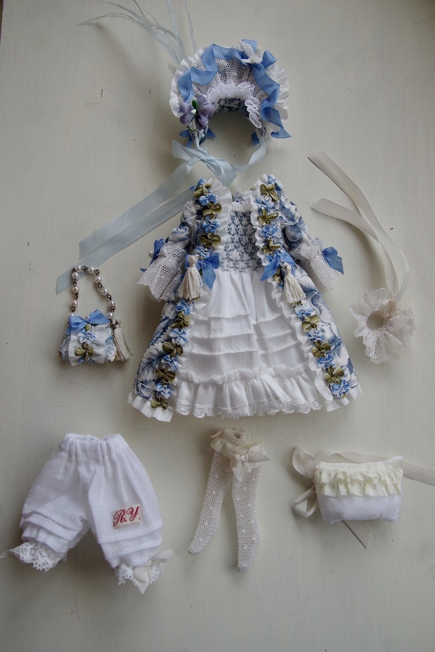 *ドレス、ハーフボネ、ネックラフ(首フリル)、バッスル(腰当て)、ドロワーズ、ソックス、バッグ 以上7点
